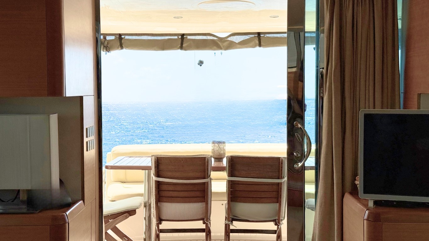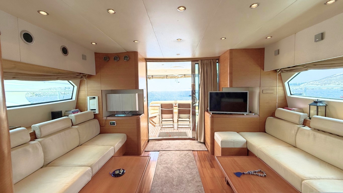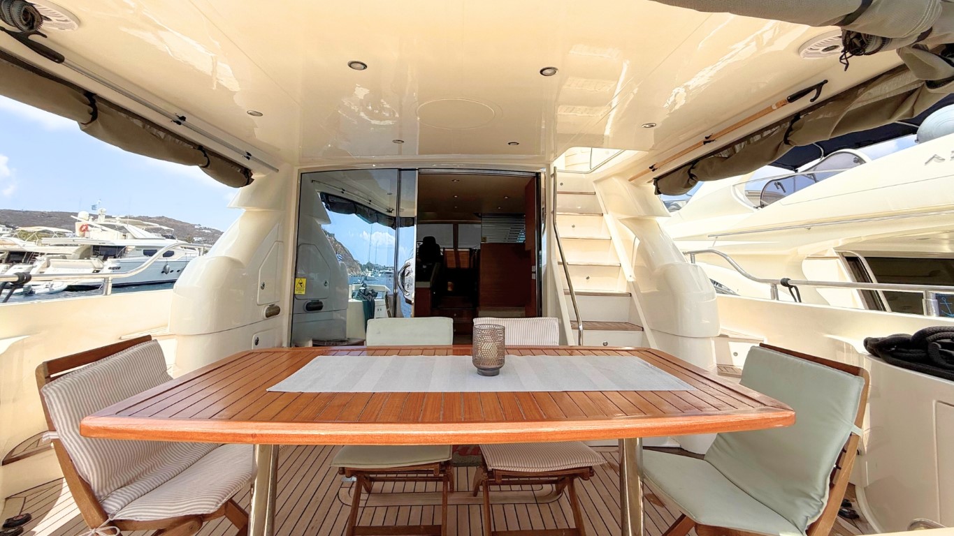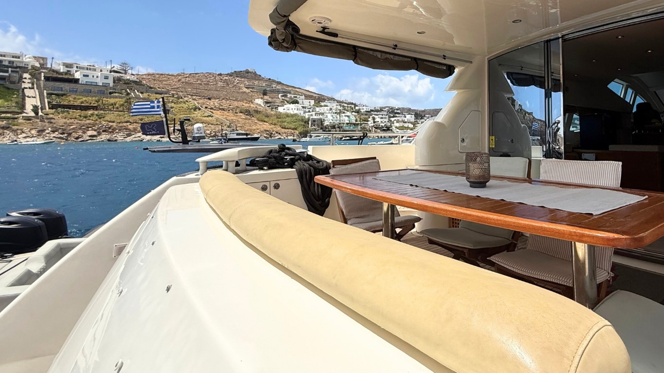She is fully equipped to impress. Her expansive flybridge, shaded aft deck for al fresco dining, and swim platform for effortless access to the sea make her perfect for soaking up the sun and exploring the crystal-clear waters of the Greek islands.