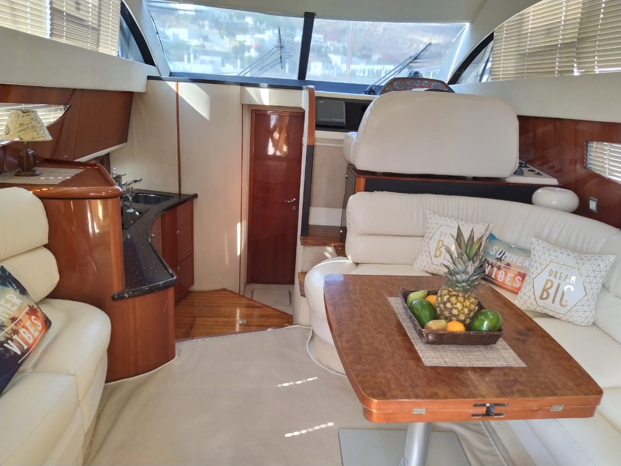 The yacht features a flybridge with sunpad, wet bar, and seating area—ideal for soaking up the sun with stunning sea views. The cockpit offers a teak dining table and comfortable lounge space for alfresco dining and socializing.