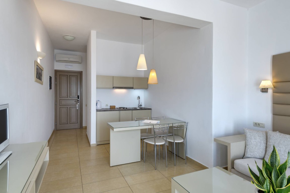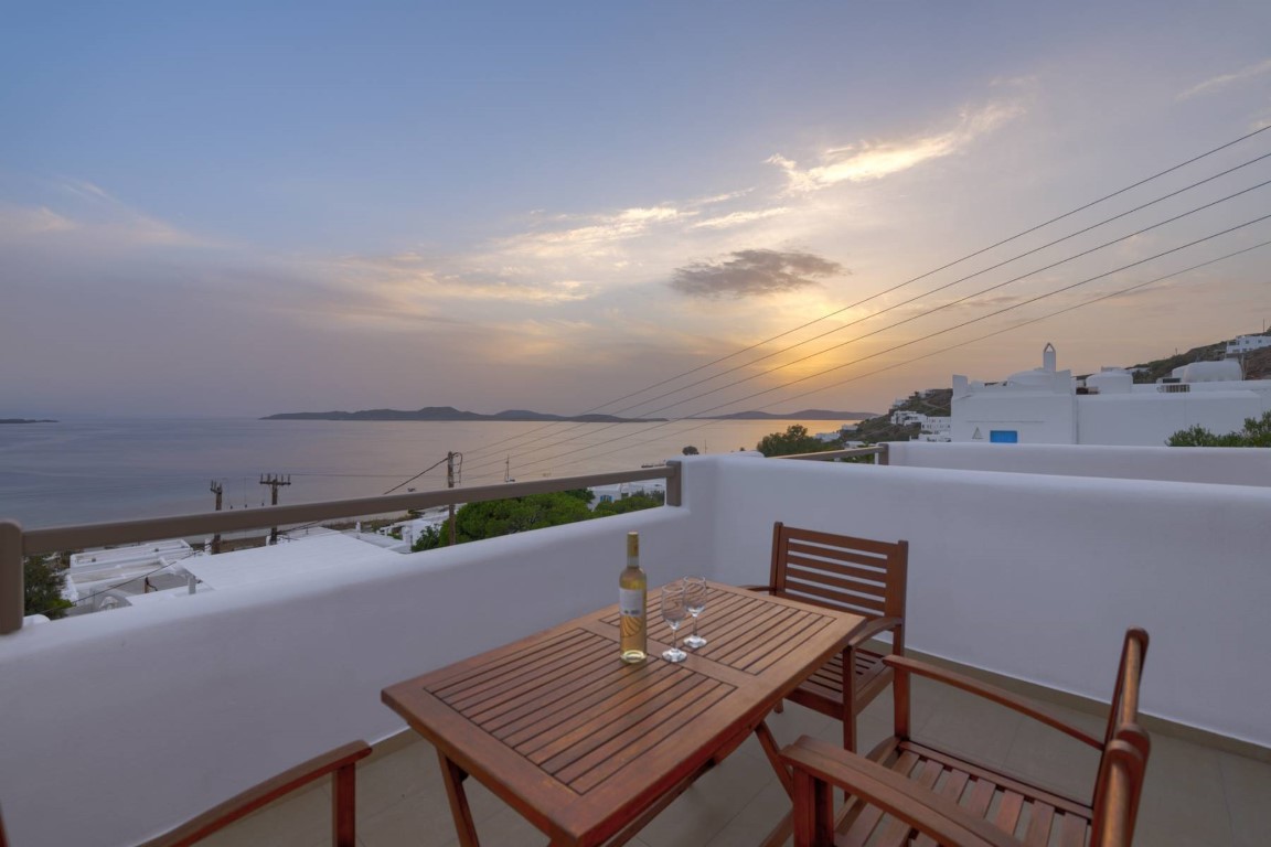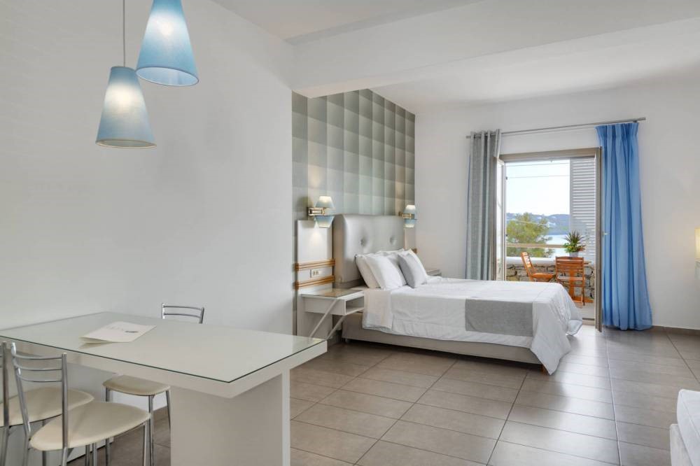 The spacious studios of Lithos range from budget to standard and offer a fully equipped kitchenette, a convenient bathroom, an air-conditioning unit, a satellite TV, a direct-dial telephone, free toiletries, a hair-dryer, a safety box, free access to WiFi and a private terrace, while the superior ones that can accommodate up to 4 persons are overlooking the Aegean Sea from their comfortable verandas.
