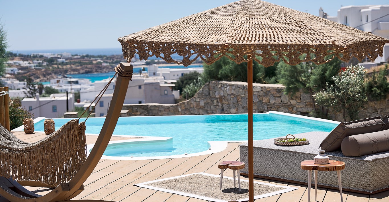Occupying a prime setting on a hill just a breath away from the beaches of Psarou and Platis Gialos, this hotel constitutes a perfect holiday option for enjoying Mykonos lifestyle and experiencing its unique glamor. The beautiful sea views from the pool terrace and the glittering swimming pool are just spectacular, be it day or night.