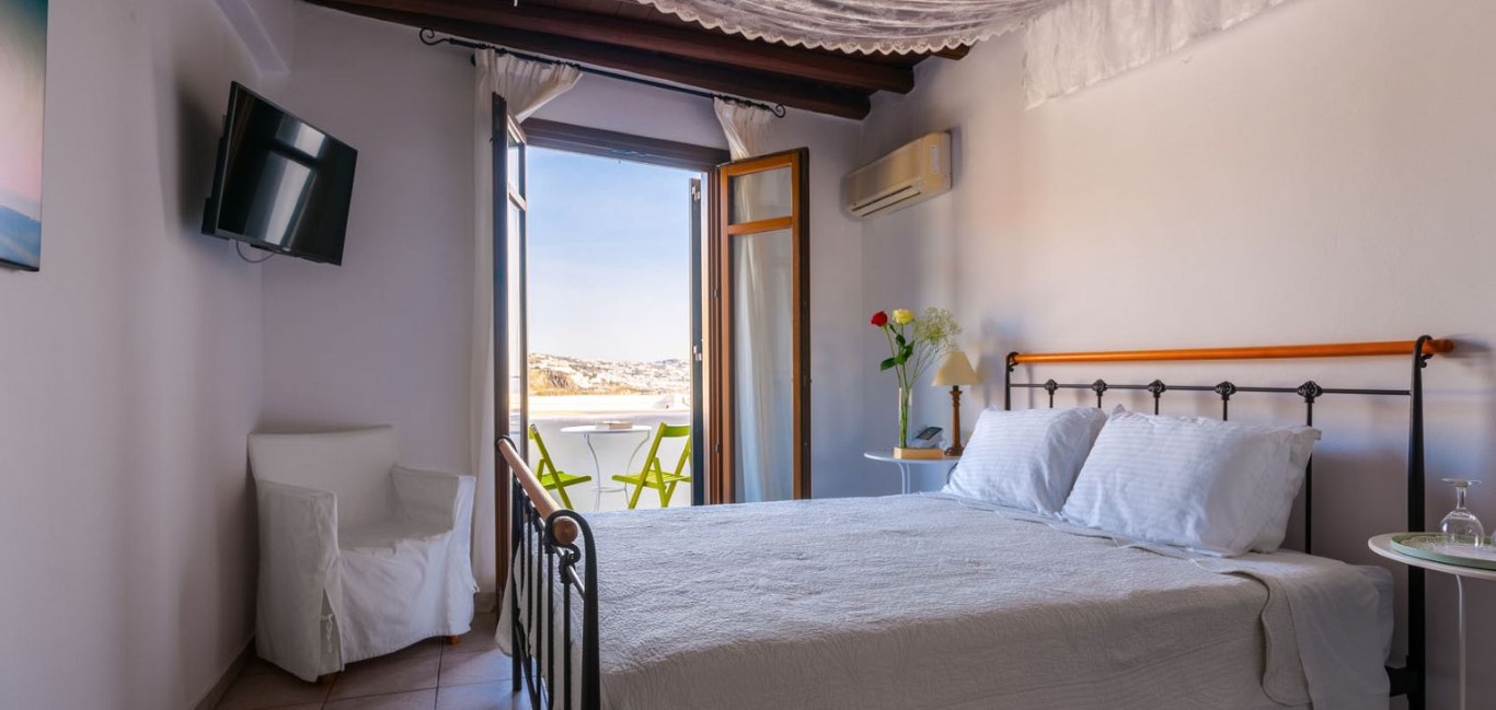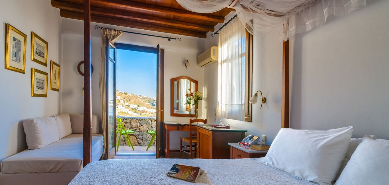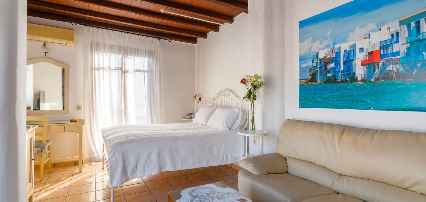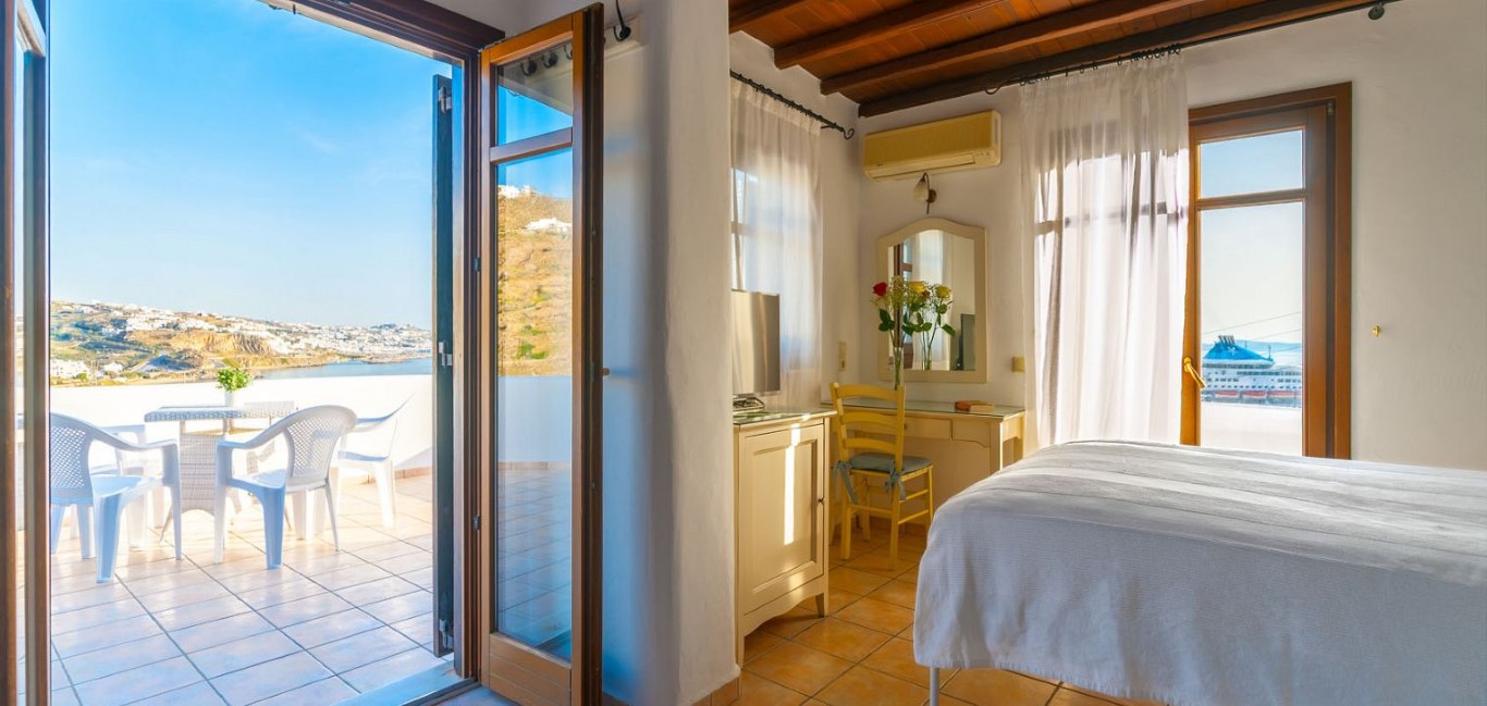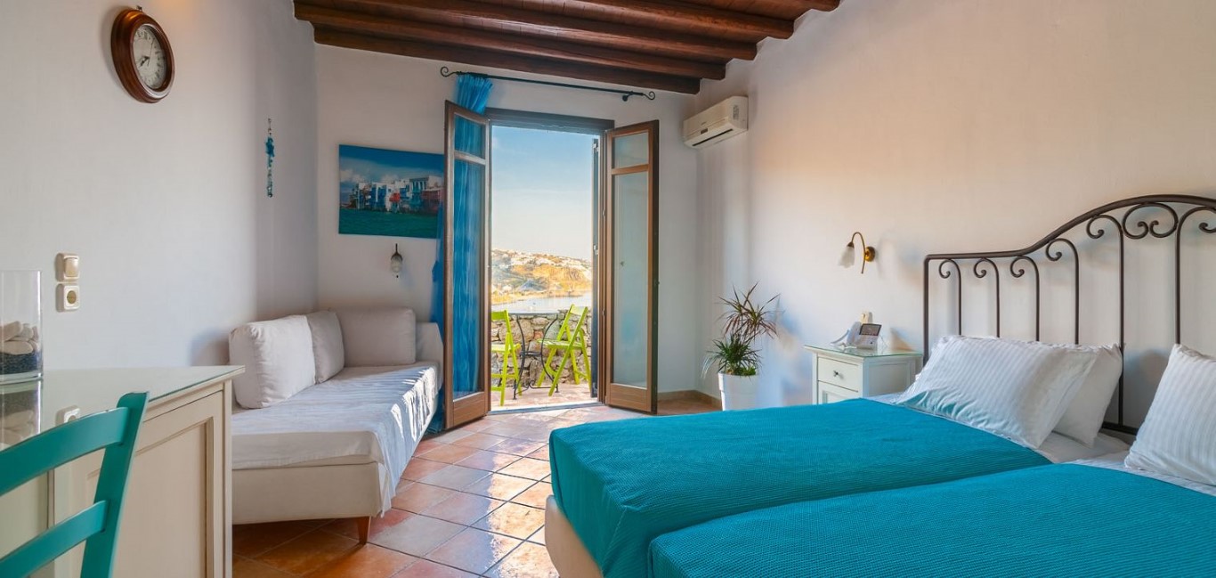 The Superior rooms are even more spacious and offer relaxing sitting areas, LCD TVs, premium bathrobes and slippers, and balconies with a magnificent view of the sea and the picturesque Chora.