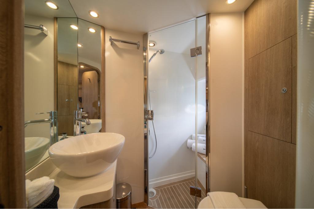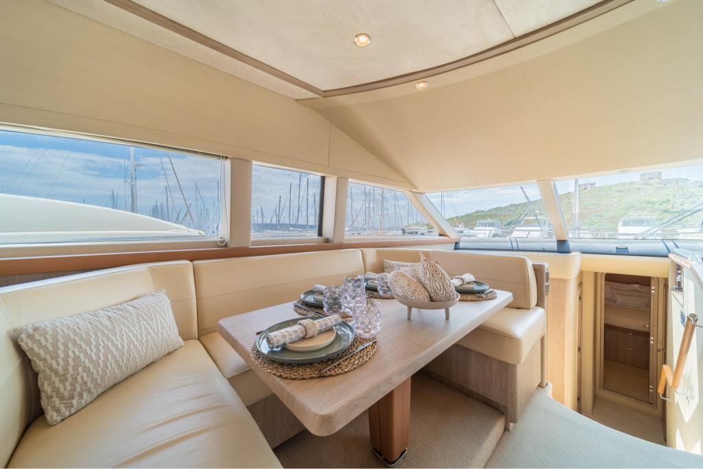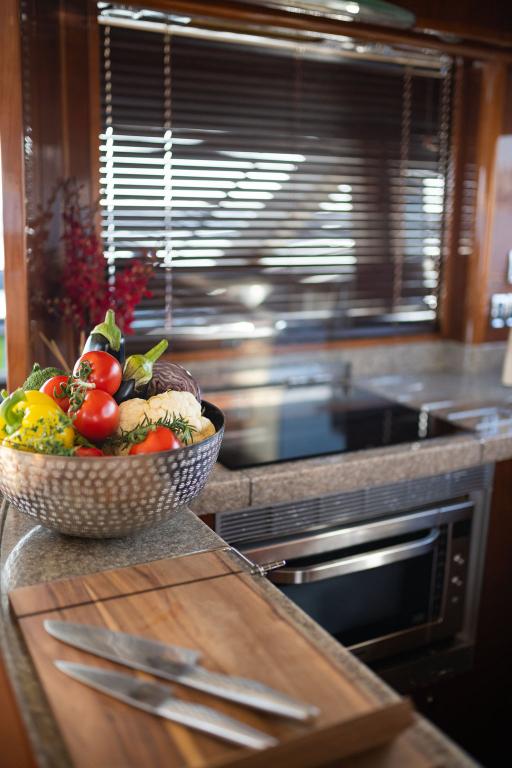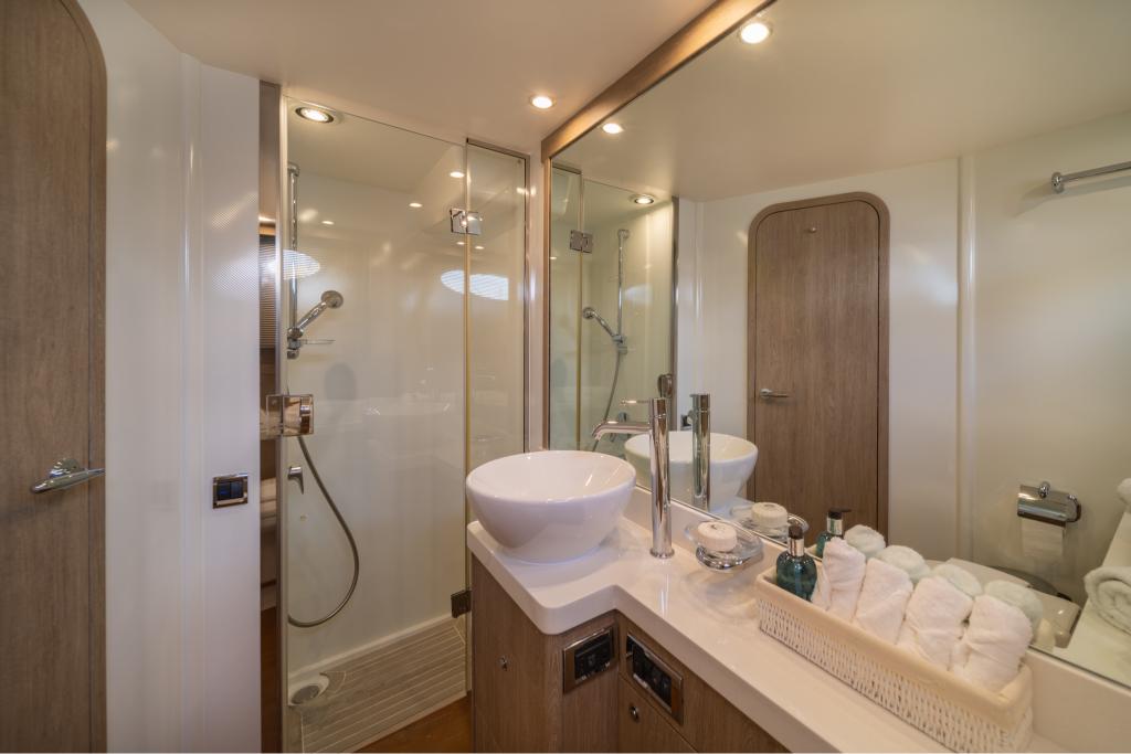 The yacht features three well-appointed cabins: a spacious Master Suite and a VIP Suite, both with en-suite facilities, a convertible Twin Cabin with en-suite amenities. The cozy dinette and fully equipped kitchen provide a comfortable dining setting, while the stylish salon offers a serene and sophisticated ambiance.