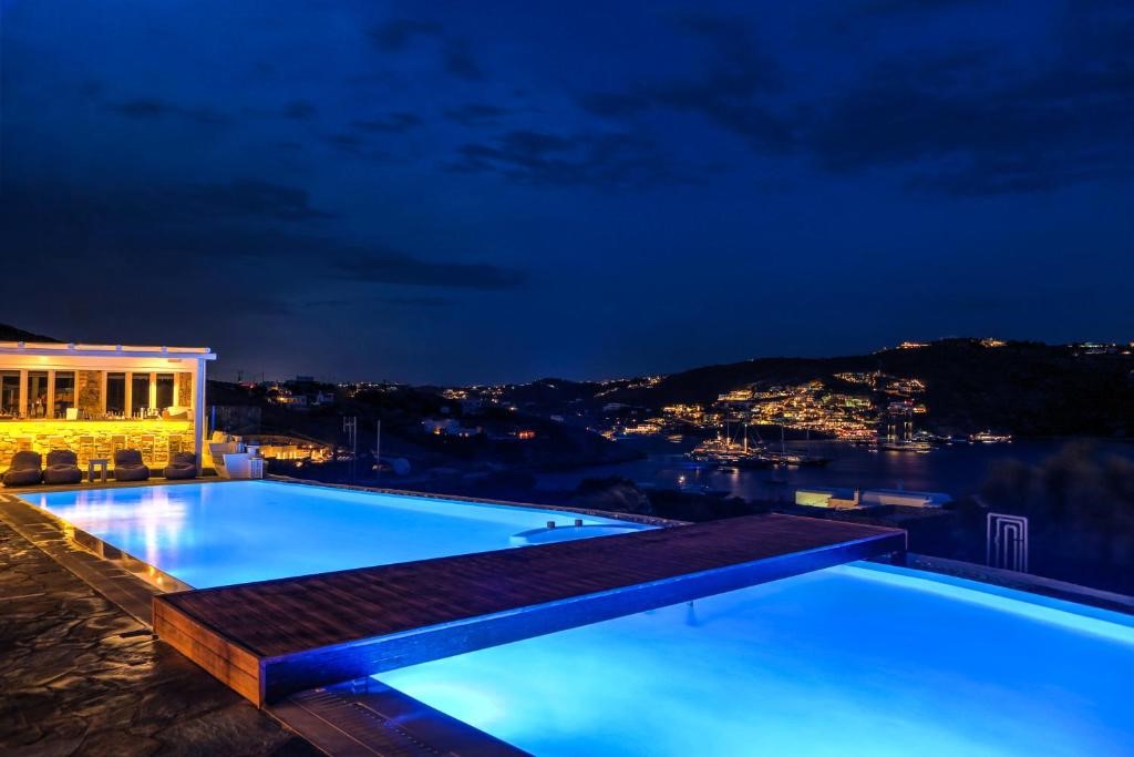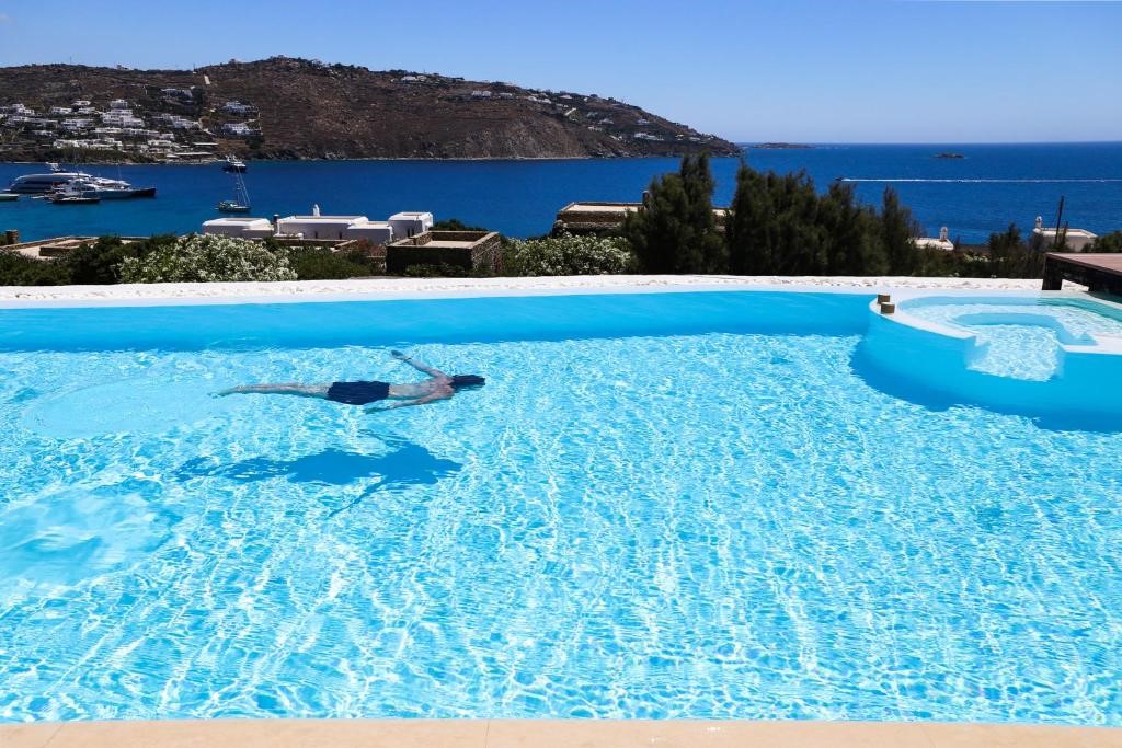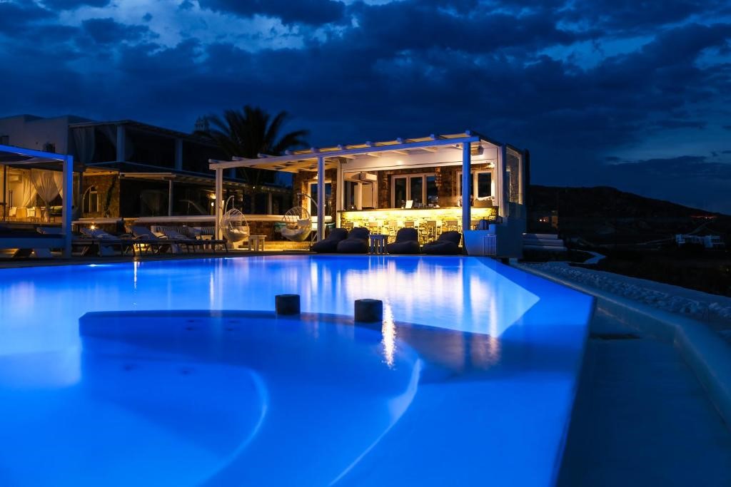 The infinity pool and jacuzzi is where you will spend the most relaxing and pampering moments of your stay on the island, surrounded by the exotic hammocks, the cozy sun loungers and the ottomans that you can indulge in, to enjoy the sublime view of the Aegean Sea under the hot Mykonian sun.
