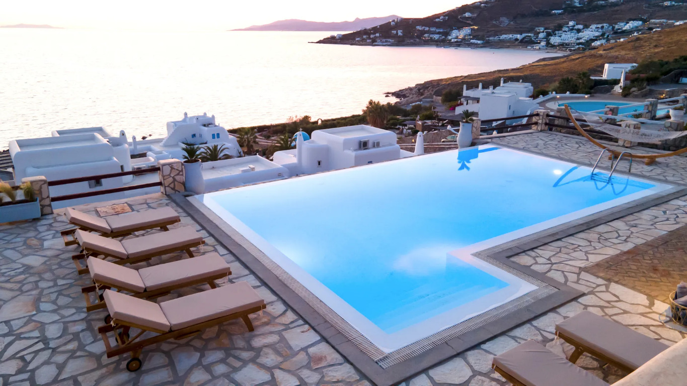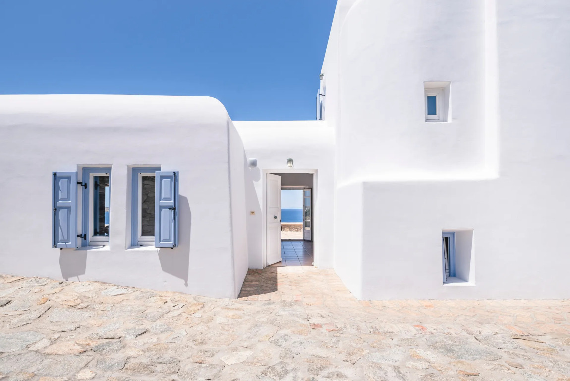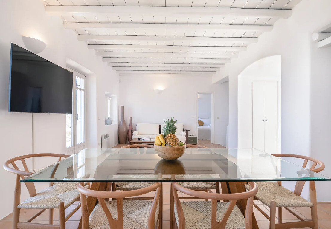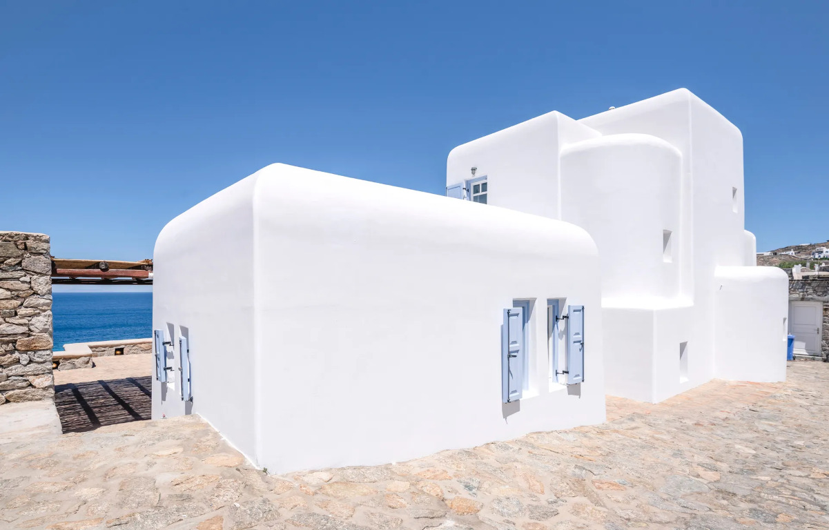 Drawing on the local architecture of Mykonos, Villa Afrodite rounded flowing shapes create a unique style that complements the whitewashed construction.