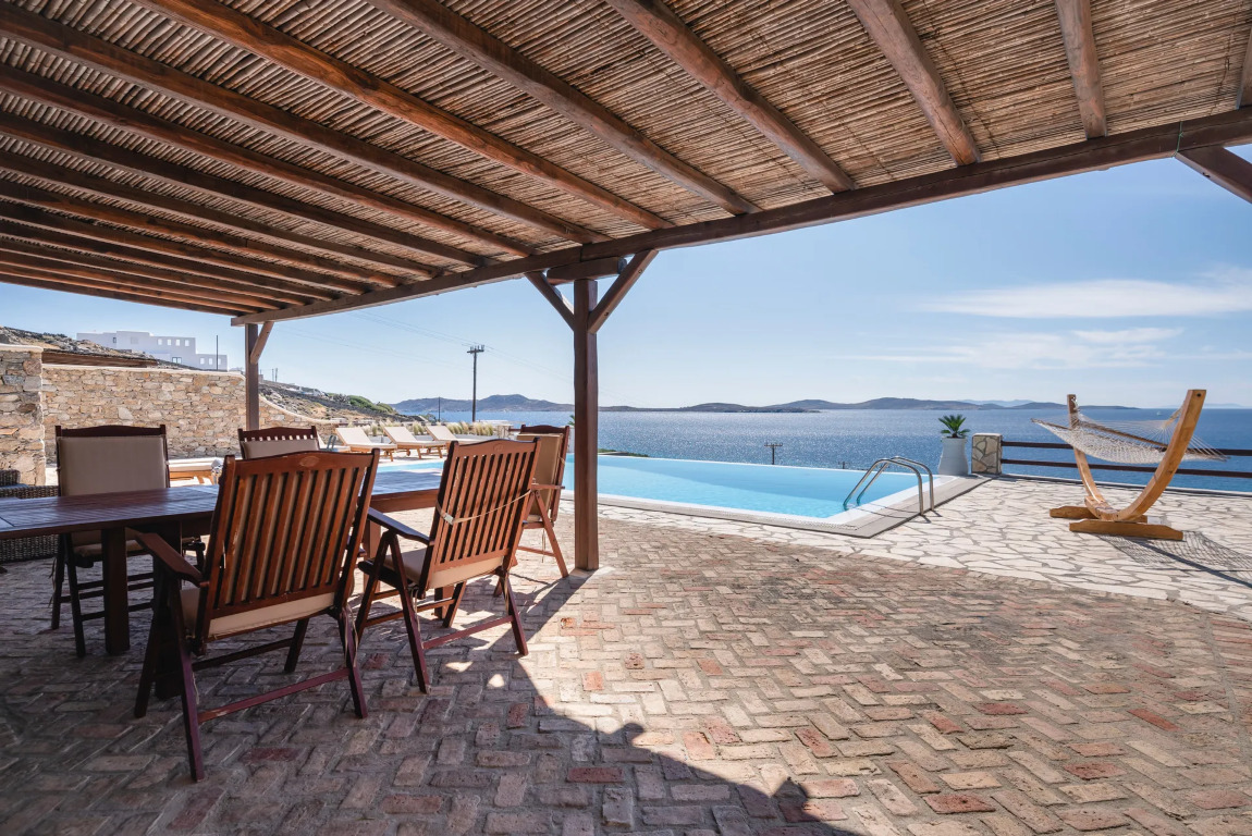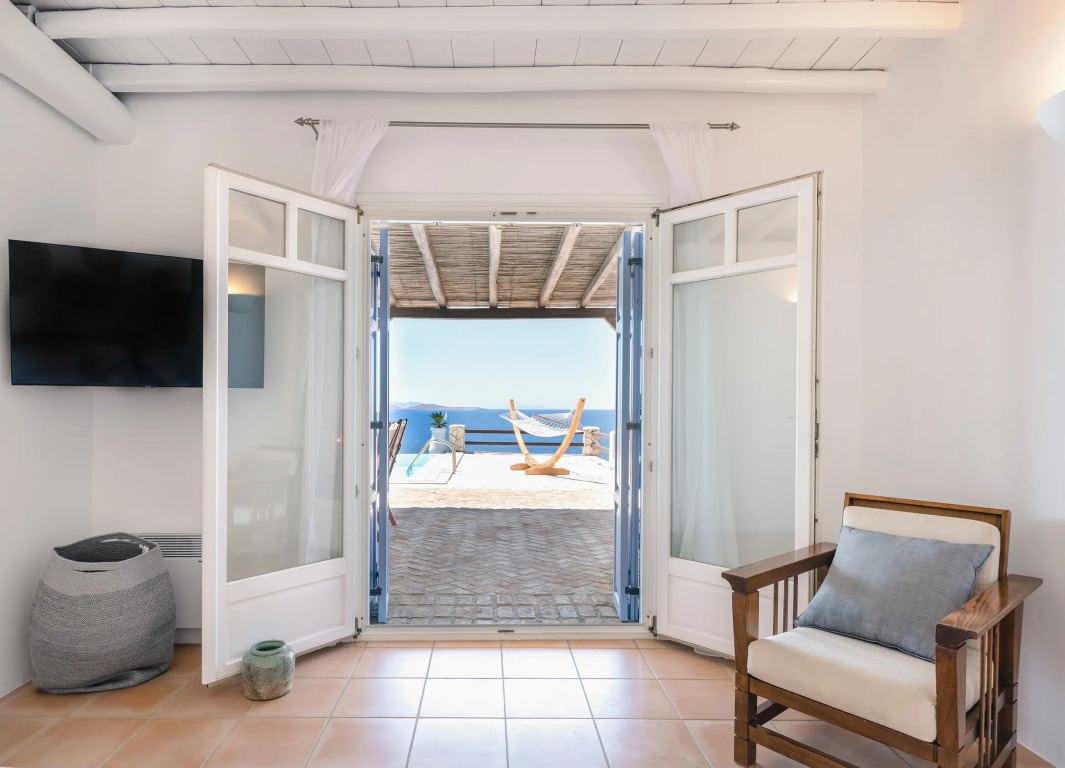 Outdoors, Villa Afrodite Mykonos offers a shaded dining area with a built-in BBQ and an unobstructed view of the sea. On the lower level, you can enjoy the large infinity swimming pool and a chill-out area with sunbeds and a hammock.