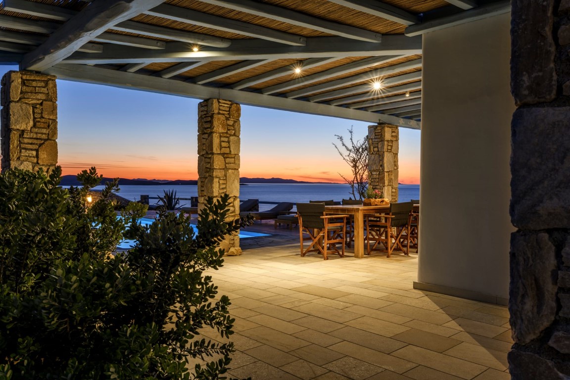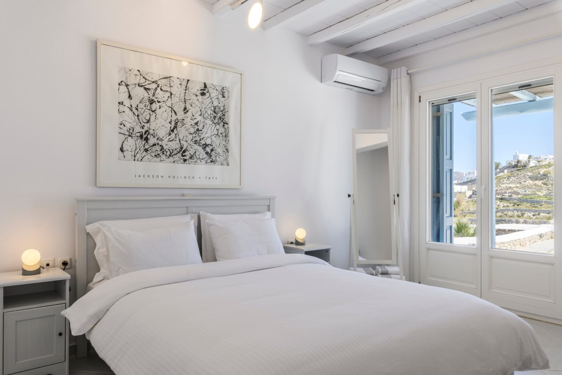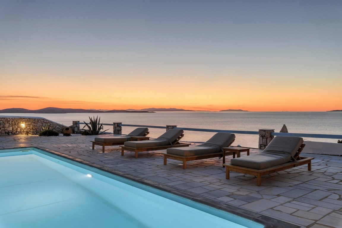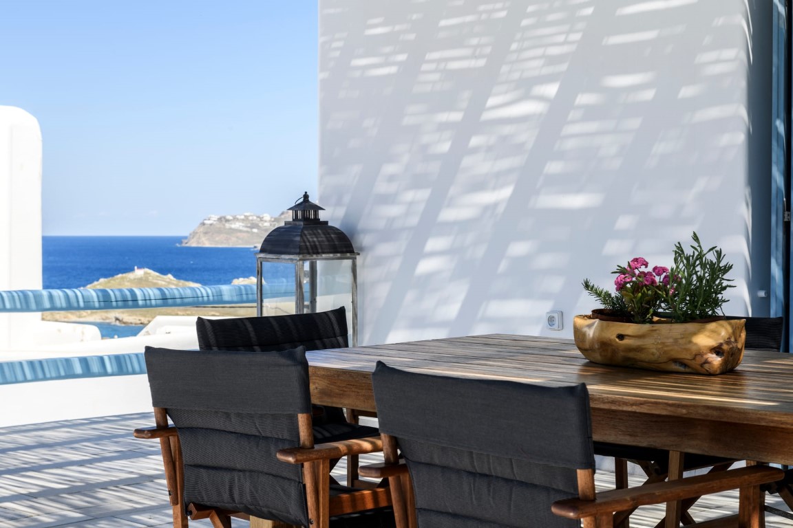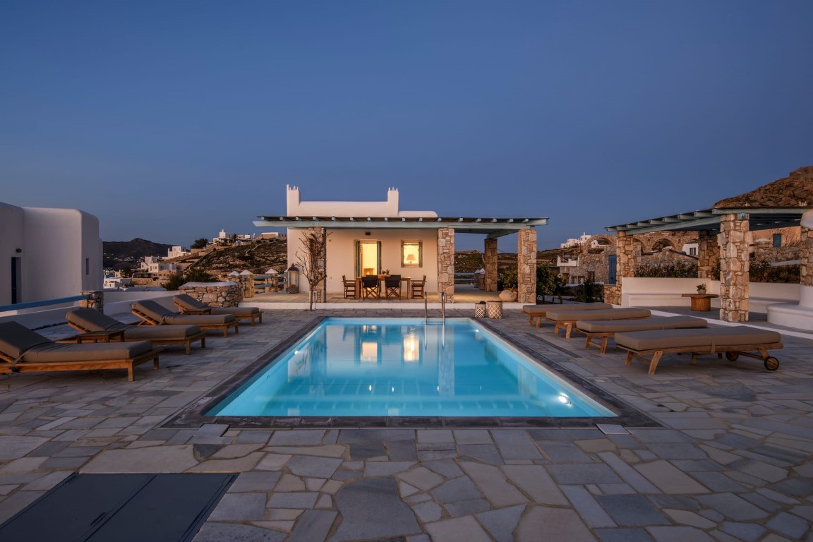 Located at Kanalia area, this villa offers unique views, overlooking the Aegean Sea, Delos and Rhenia Islands and Mykonos Town and it is also close to the Ornos Beach, where the famous Kuzina beach restaurant is located.