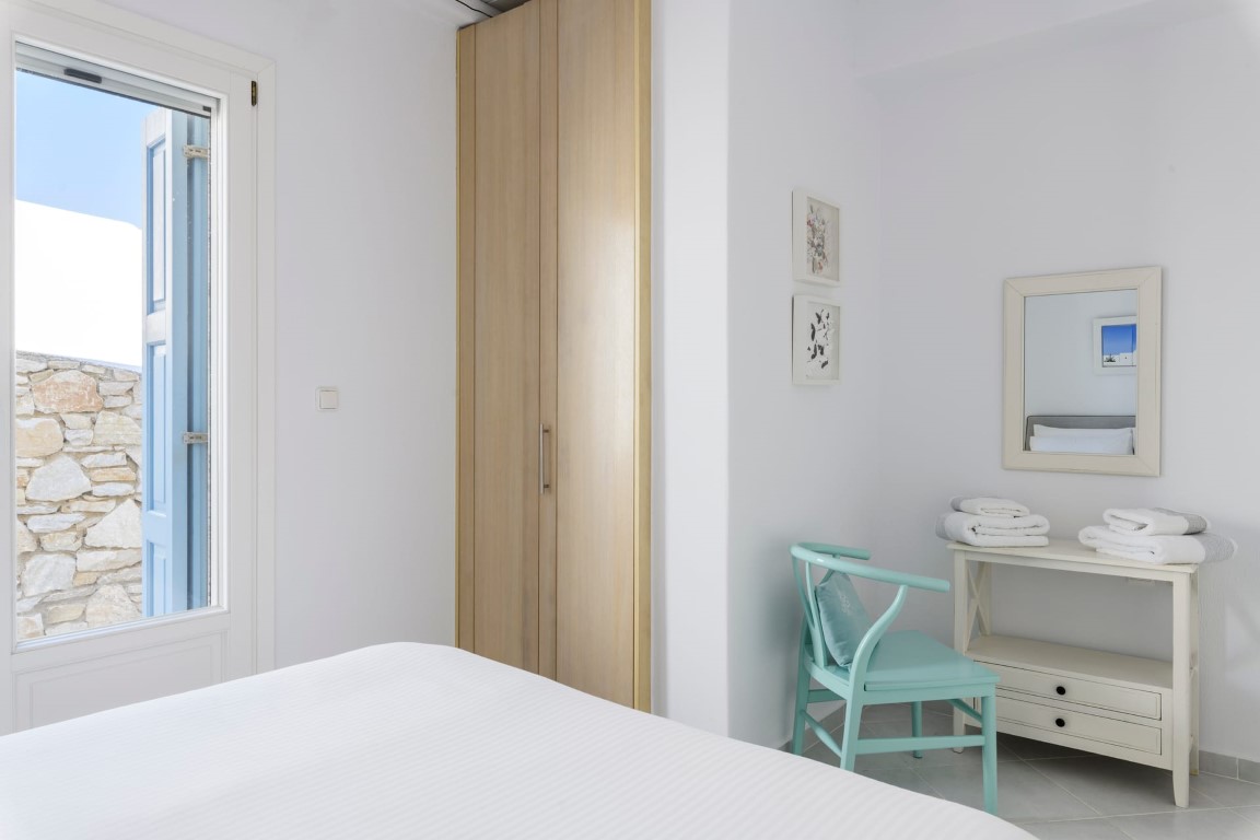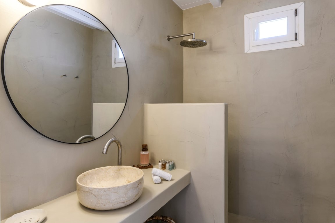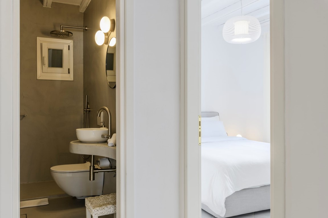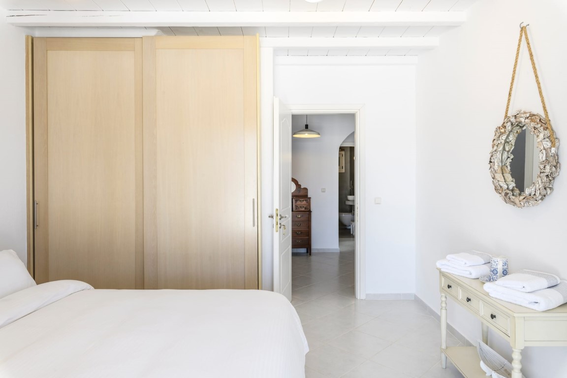 On the Entrance level, guests will enjoy the living room with fireplace and view to Mykonos Town and Aegean Sea, a fully equipped kitchen with connecting BBQ area, and the dining area. On the same level there is also a guest WC.