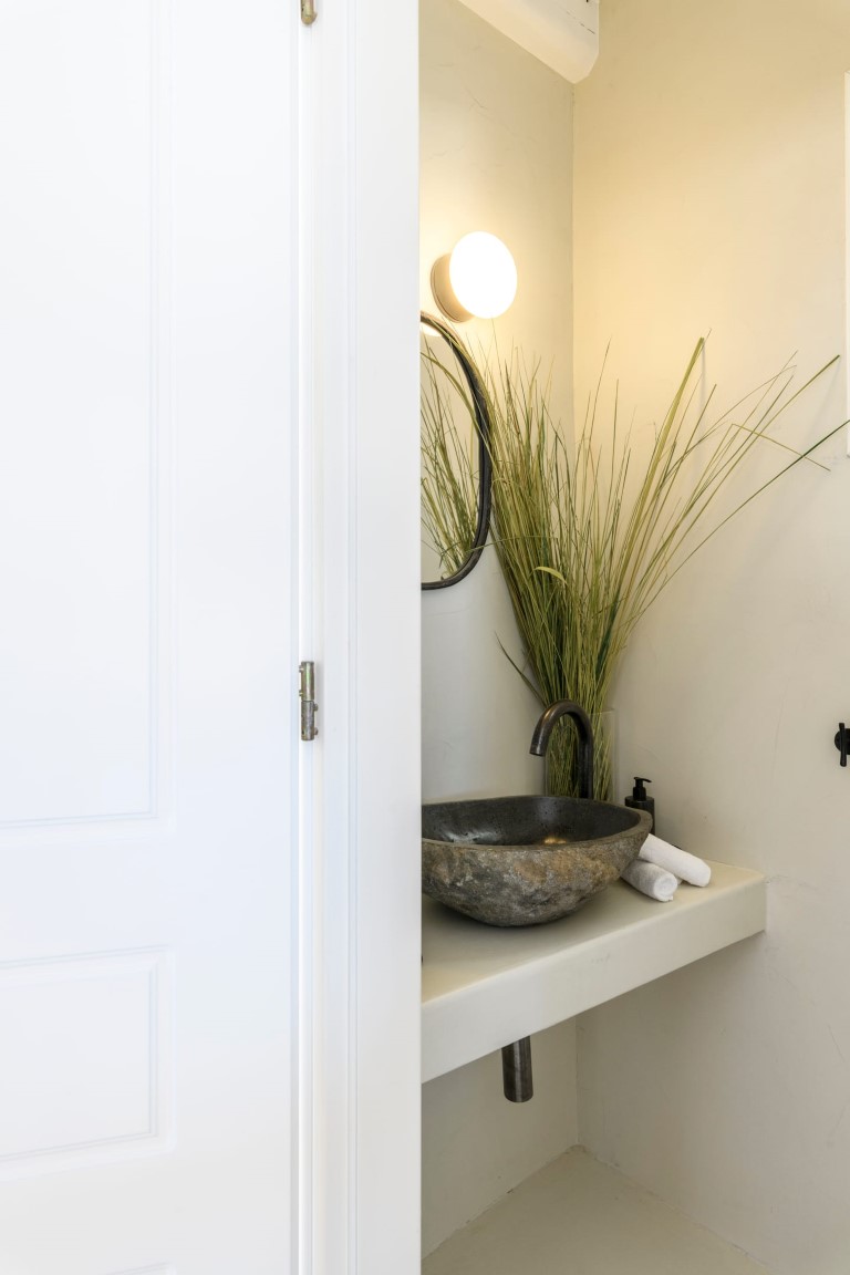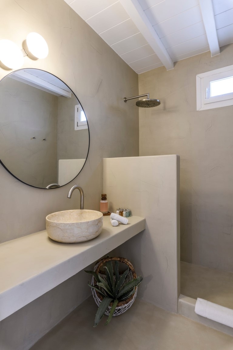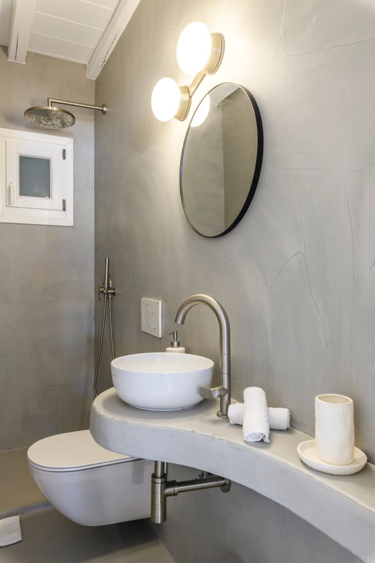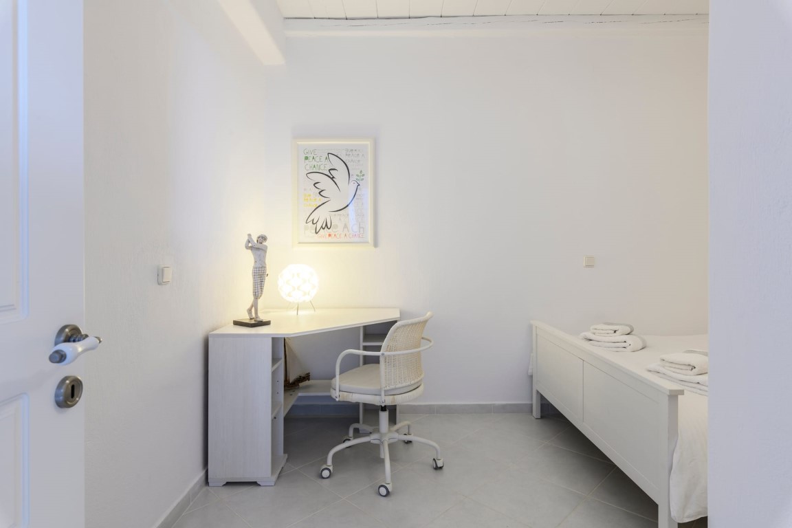 On the Entrance level, guests will enjoy the living room with fireplace and view to Mykonos Town and Aegean Sea, a fully equipped kitchen with connecting BBQ area, and the dining area. On the same level there is also a guest WC.