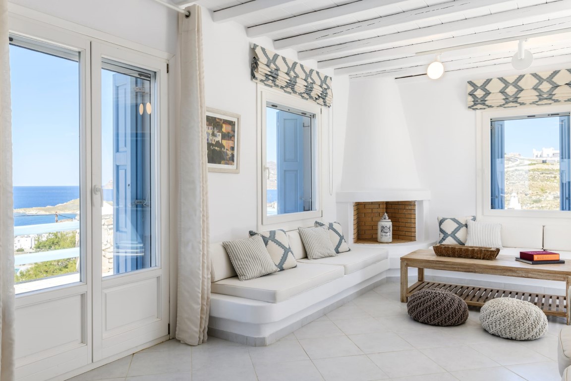✓ Living room with fireplace and view to Mykonos Town and Aegean Sea